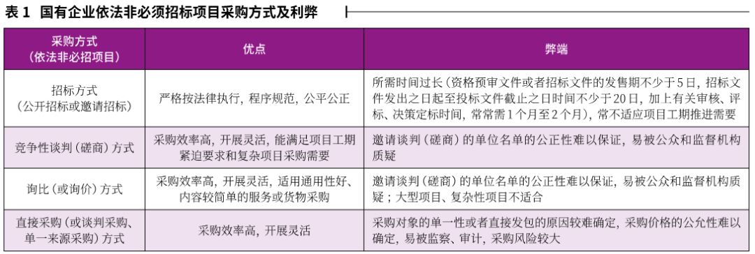 對(duì)于國(guó)有企業(yè)依法非必須招標(biāo)項(xiàng)目,可以選擇招標(biāo)方式,也可以選擇競(jìng)爭(zhēng)性談判、競(jìng)爭(zhēng)性磋商、詢比(或詢價(jià))、直接采購(gòu)(或談判采購(gòu)、單一來源采購(gòu))等方式,這些方式各有利弊,具體見表1。